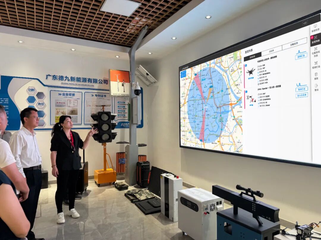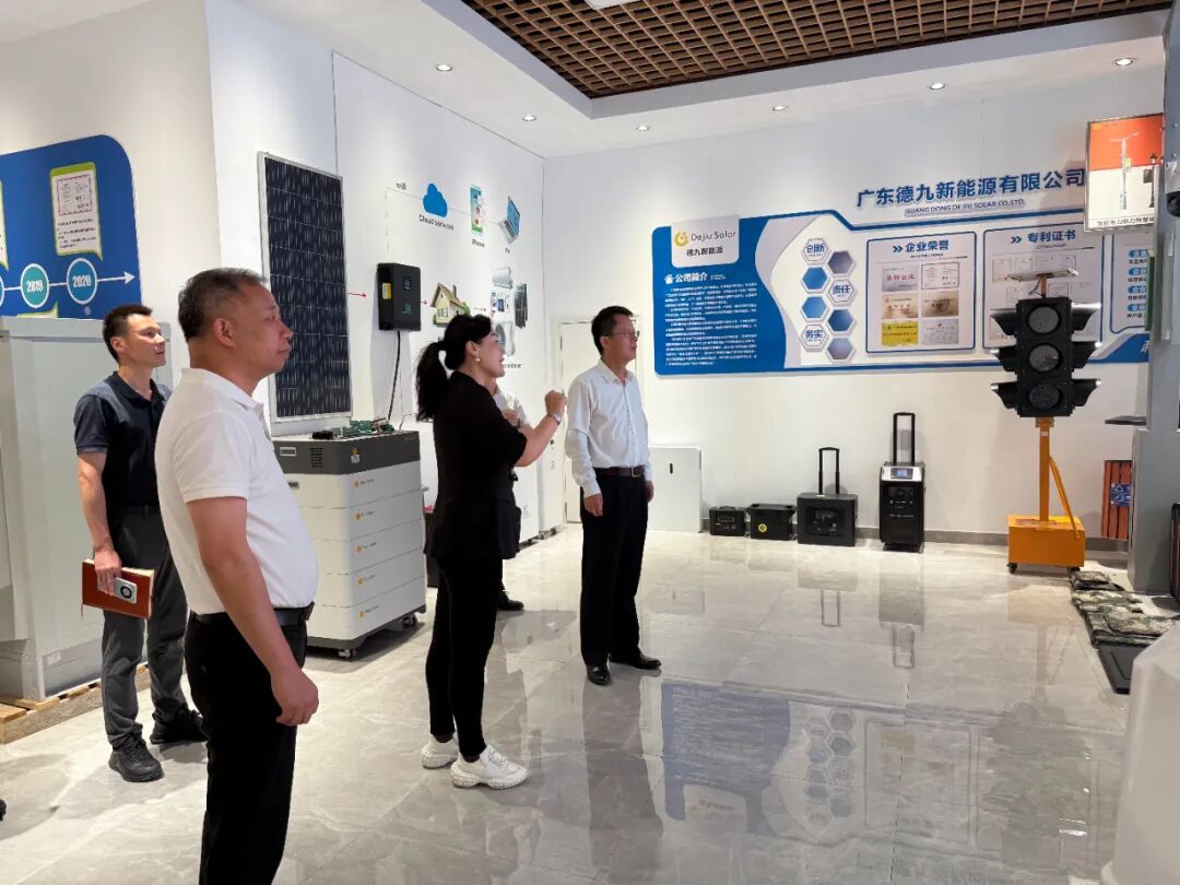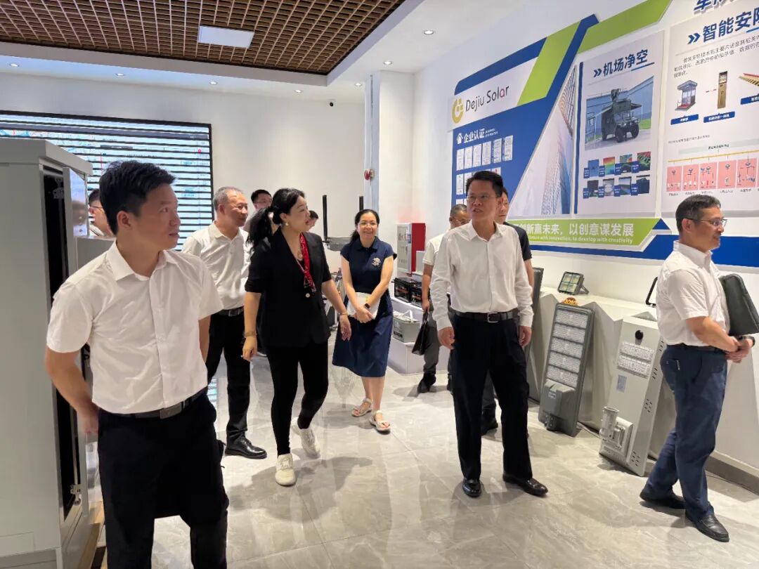 The delegation visited the Guicheng Base of Dejiu New Energy, where the company’s achievements in the fields of photovoltaic, energy storage and drone countermeasures were fully displayed.